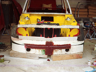 Ich nutzte die Gelegenheit auch um einige Teile und Konstruktionen zu verbessern. Die vorderen Kotflügel, die immer noch aus Blech und GFK waren, wurden durch komplette GFK-Kotflügel ersetzt. Hier auf dem Bild noch grundiert. |
