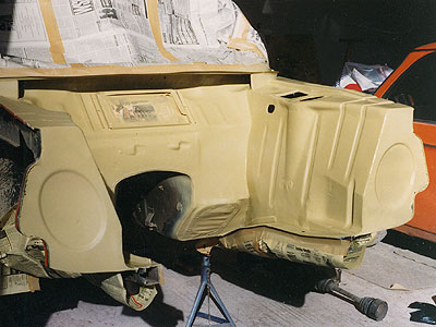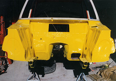 Die hinteren Dome wurden für McPherson Federbeine vergrößert und umgeändert, um bei evtl. Umbau nicht alles noch mal lackieren zu müssen. Zusätzlich wurde eine Domstrebe, ein Catchtank, und zwei elektrische Benzinpumpen eingebaut.
