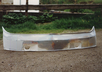 Einen Frontspoiler sollte mein BMW 2002 jetzt auch bekommen, so kam mir die Idee einen originalen Gruppe 2 Frontspoiler ein wenig abzuändern, was den CW-Wert verbessern sollte. Erst mal in 4 einzelne Teile geschnitten, und dann mit viel GFK--Matten, Polyesterharz und Spachtelmasse in die richtige Form gebracht. |