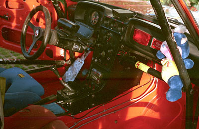 Der OMP Stahlkäfig wurde durch einen RUBI Alukäfig ersetzt. Die Pedalerie des 3er BMW E 21 wurde erleichtert. Pedalerie, Lenkung, Schalthebel und Fahrersitz wurden ca. 20cm nach hinten versetzt wegen besserer Gewichtsverteilung . Der Sparco Monza Fahrersitz wanderte auf die Beifahrerseite, und als Fahrersitz verbaute ich einen OMP Rennsitz. Als Fahrergurt diente jetzt ein Sabelt 6-Punkt-Gurt mit Zentralschloss.